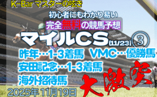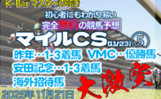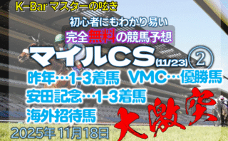 本日も読んでいただいてありがとうございます。こんにちは、マスターです。昨日はGI8連戦の2戦目マイルCSでした。馬連🎯的中でGI-8連戦…✕〇□□□□□□となりました。主要5印で4頭が掲示板1・2・4・5着と3~5着混戦の中で…ただその後何...