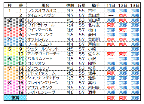 重賞が東京-東京-京都で行われる中すべてその通り騎乗依頼を受けるのも大したもんだが、このレースを大切だと思ったら、日曜の東京をスキップして京都に戻り前日に騎乗して馬場をチェックする…という動きがあってもおかしくない。
