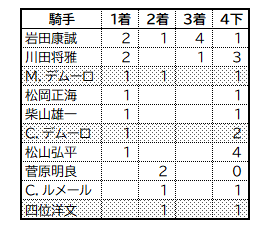 過去10年で2回以上スワンSに乗った事のある騎手の成績を一覧にした。