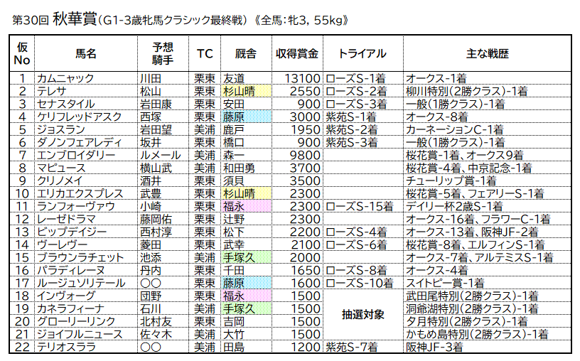 三冠最終戦に一冠目桜花賞馬エンプロイダリー、二冠目オークス馬カムニャックともに参戦です。