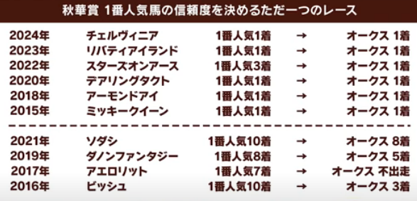 次にオークスと秋華賞の関係です。某動画でこんなわかり易い説明がありました。折角ですのでご覧ください。どんな秋華賞で1番人気になった馬がオークスでどうだったか?そしてこのレースでどうだったか?が一覧になっています。(過去10年)