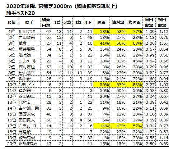 勝鞍数順に並べています。川田騎手が圧倒的なのはご覧の通りです。が加えて注目しておきたいのが武豊騎手ですね。勝率は川田騎手を上回る流石「庭」なだけはあります。現在は川田騎手の方が遥かに有力馬の騎乗依頼が多い中で武豊のこの成績は驚異的です。それが単勝回収率にも現れていると思います。