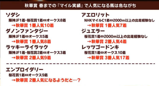 逆に2番人気がほぼ確定している桜花賞馬⑪エンプロイダリーはどうでしょうか?これも同じ動画にわかり易く纏まっています。「春にマイルで評価を上げたもののオークスで凡走。「2400mが長かった」ので2000mならまだ大丈夫なんじゃないの?…と2番人気になった馬の成績です。(過去10年)