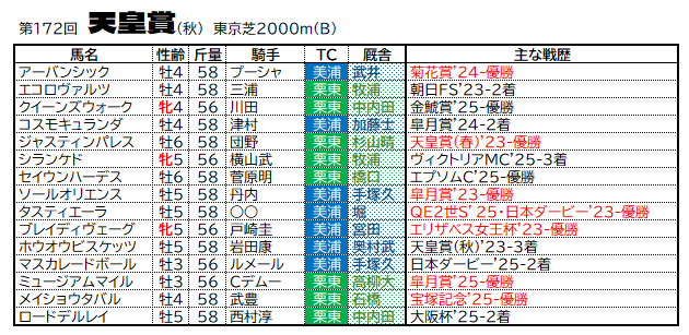 アーバンシック(菊花賞)…その素質はデビュー前から噂されていた。3戦目の重賞2着で賞金加算をして皐月賞・ダービーへ挑戦したが4着11着と結果が出なかった。ひと夏超えてパワーアップし前哨戦セントライト記念を勝ちその勢いで菊花賞も制した。ただその後3戦はG1=6着→G2=3着→G3=14着と冴えない。去年のこの時期にG1を勝っているのでいつ走ってもおかしくないものの昨今のパッとしない状況と「5走継続騎乗していたルメールが手放す」状況を考えると買いづらいですね。