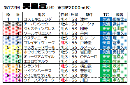 ジャスティンパレス以外、内は関東美浦の馬、外は関西栗東の馬。