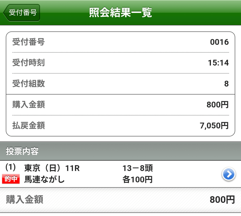 馬連(流し)…⑮-⑬③②⑦⑯④=6点x200円=1,200円