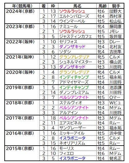 ご存知の通りこのレースは過去10年…2015~2019年=京都競馬場、2020~2022年=阪神競馬場、2023~2024年=京都競馬勝で行われています。