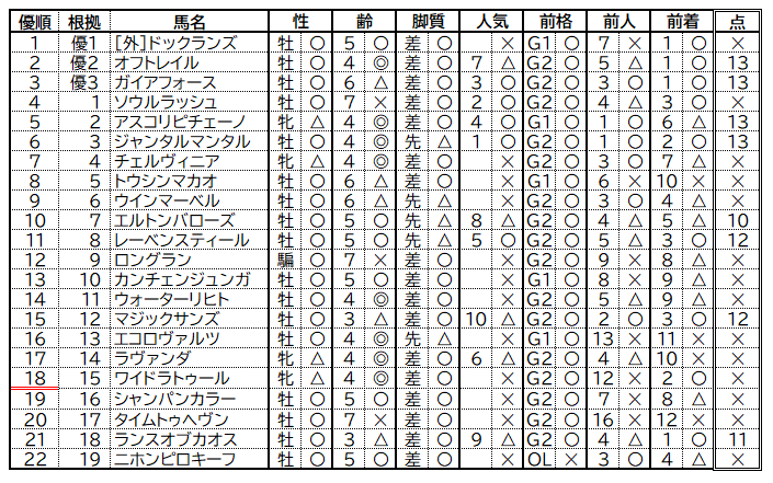 ・当日人気⇒1-2着は5番人気以内、3着は10番人気以内、11番人気以下は✕