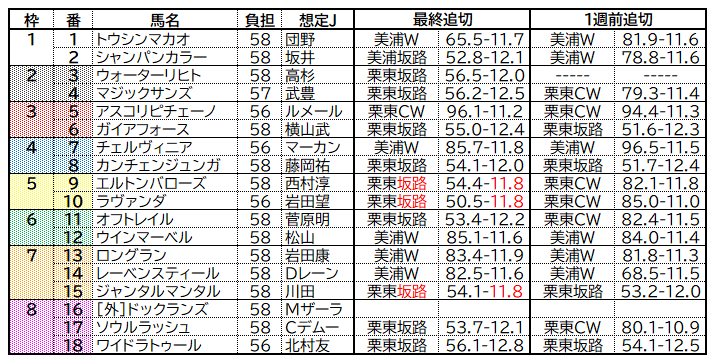 ⑰ソウルラッシュも最終追切は最終確認だけだが1週前追切で80.1秒と自己2番目の早い時計を出してみせた。こちらも好調持続…といったところです。