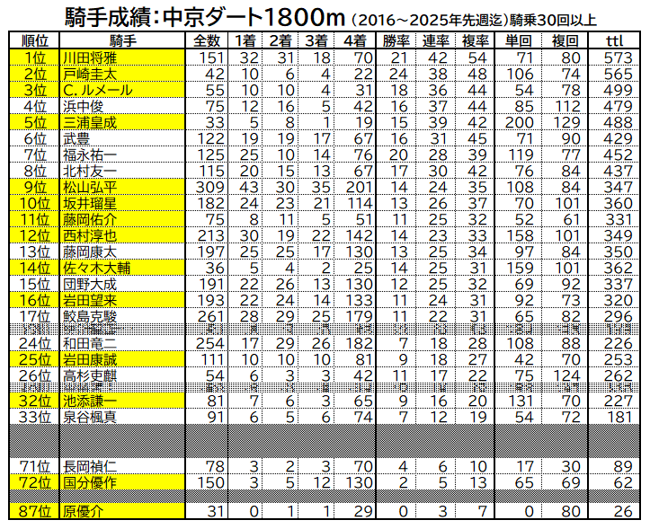騎手成績ですが、独自のポイント計算した結果が下記の通り。