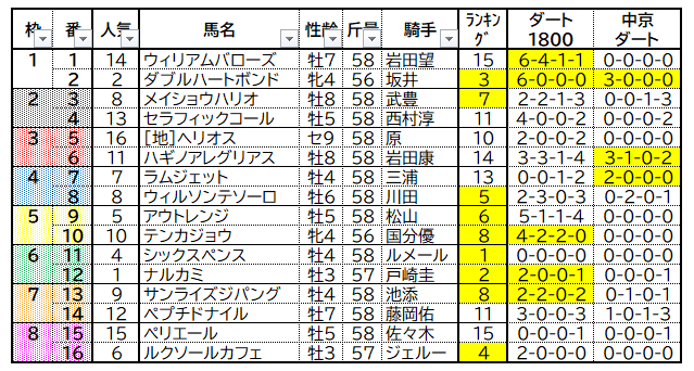 週中5日間検討してきた結果に《中京ダート実績》《ダート1800m》を加えたのがコチラ