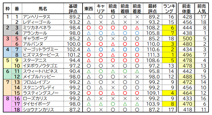 逆に2位だった⑦マーゴットラブミーは重賞経験無し+平均距離もマイルを下回る+馬格が無い3重苦で少し評価を下げざるを得ない。