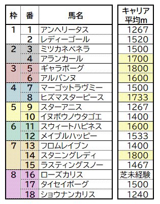 この舞台は桜花賞でも使われる。桜花賞時に良く言われるのが「乱ペース」。これを乗り切るにはスピードだけでは無理。乱れたペースについていきながら最後の急坂で伸びる脚=スタミナが必要。故にこのレースでも距離短縮組や同距離組が強い。では出走馬のキャリア平均距離を見てみよう。