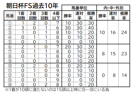 MAX18頭立ての馬番別成績を作成した上で、今回の14頭の部分でブッた切った結果だ