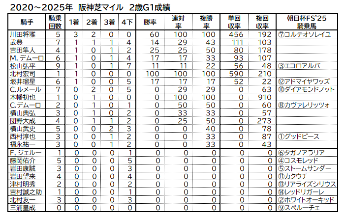 2020~2025年の阪神芝マイルで行われた2歳G1の騎手別成績です