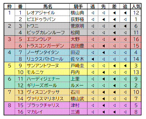 上記でお知らせした通りキャリアの浅い馬の集まりですから、どうしても前目に行きたがる馬が多い…通り、このレースは逃げ馬が過去10年間で2勝している反面全体でみると差し馬が活躍しています。そこで今回出走する馬の位置取りを一覧にしてみました。