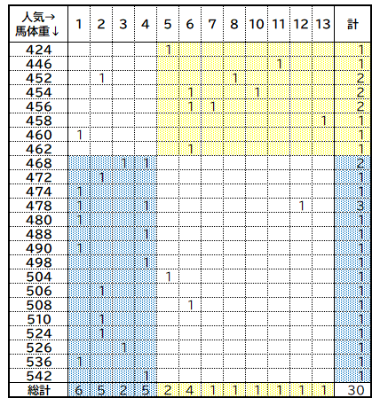 こちらをご覧ください。対象期間で馬券対象になった30頭の《人気と馬体重》の関連性です。